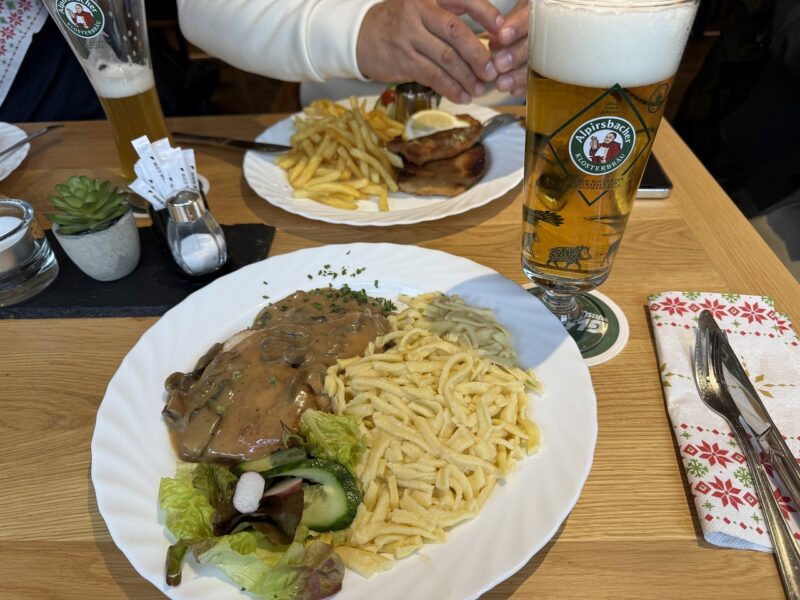 フロイデンシュタットにて昼食、山の中にあるこの街も好きな場所です。いつか泊まって散策してみたい場所のひとつです。ドイツの事はほぼほぼ大絶賛しておりますが、余り好きじゃない料理もあります(笑)。そのひとつがシュペッツレ・・・付け合わせの料理なので、うわー入ってるって感じです。久しぶりに食べて再確認、これは私の人生には必要ない・・・つけ合わせって量じゃないくらい盛ってある。想像通りの素朴なパスタ。