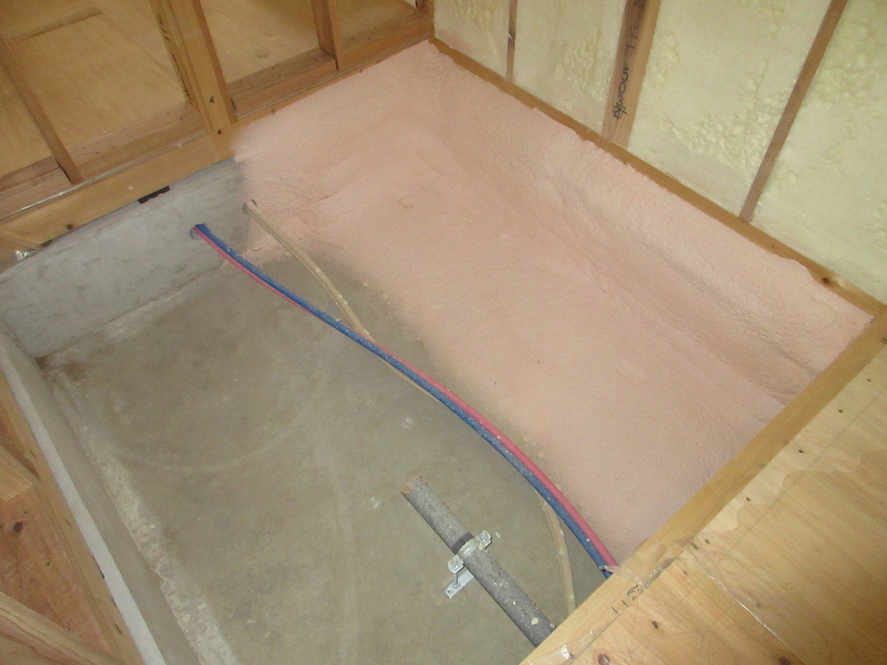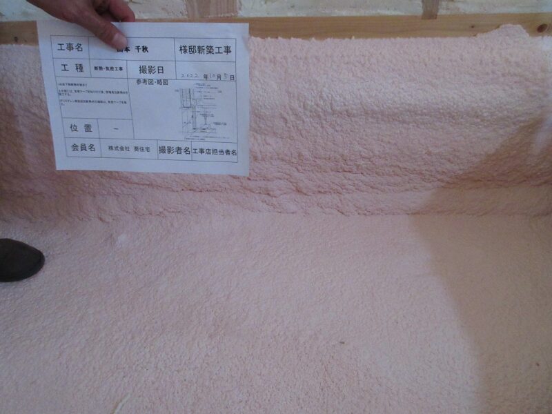 基礎立上り部分に75㎜の厚みで吹付施工、水平部分は30mmの厚みで50cm以上施工してます。設計の仕様以上の厚みと吹き幅になっておりますので、数値以上の性能を有します。土台部分から施工してますので、断熱材の連続性も確保、コンクリートの打ち継ぎ部分等も被膜出来るので、個々が弊社の高い気密性に繋がるんです。