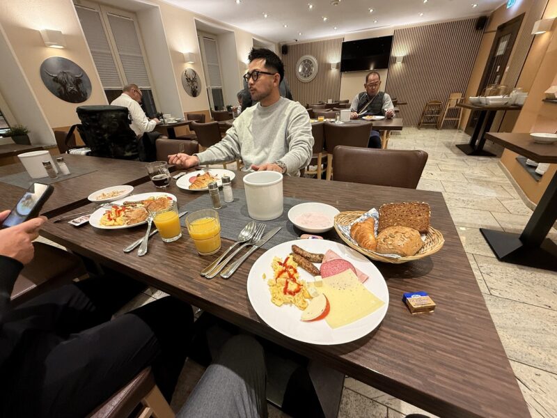 2次会のお誘いを断腸の思いでお断りしたお陰で、朝には体調も随分と良くなりました。お楽しみの朝食です♪体調不良とか言ってる人の食べる量じゃないかも知れませんが、ドイツはパンが美味しくてついつい取り過ぎてしまいます。皆さん結構お米が食べたいなど言ってますが、私はそこまで無くて・・・4泊くらいなら全然大丈夫。変な日本食食べるくらいなら、普段食べれないドイツ料理で失敗したい(笑)